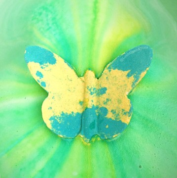 As the Lemon Butterfly bath bomb charges around the bath it creates the most beautiful green and yellow bath art as seen in the photos below. For its size the Lemon Butterfly bath bomb is quite the slow fizzer, ensuring you stay in the bath for that little bit longer soaking up all of its goodness.