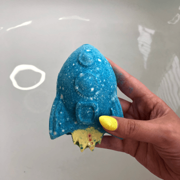 As the bath bomb fizzes away blue and yellow foam fizzles out of it, giving the illusion of it actually gliding through your bath water. It isn’t long after placing it in the water that it begins to gently charge around the bath leaving a yellow, star scattered streak behind it, much like a plane in the sky that leaves a small line of cloud behind.